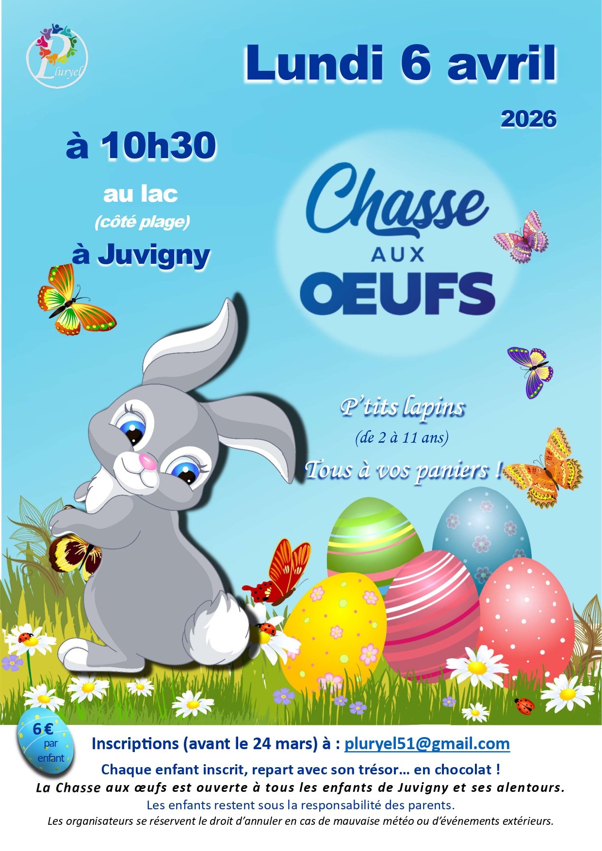 P'tits lapins âgés de 2 à 11 ans, accompagnés des parents, nous vous donnons rendez-vous lundi 6 avril à 10h30 pour une chasse aux oeufs au lac (côté plage) de Juvigny. À très bientôt.