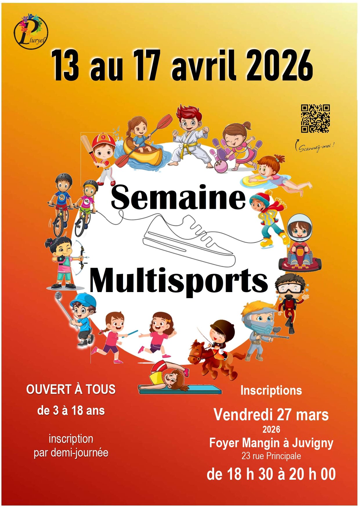 Enfants âgés de 3 à 18 ans, les inscriptions à la semaine multisports auront lieu vendredi 27 mars de 18h30 à 20h00 au rez-de-chaussée du Foyer Mangin (23 rue Principale à Juvigny). Pour toute info complémentaire, n'hésitez pas à nous contacter (pluryel51@gmail.com).